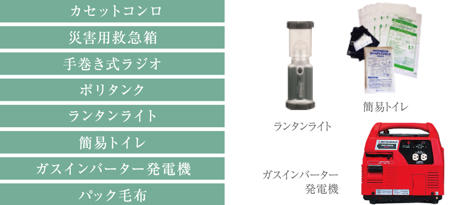 万一の災害時に備えて、住民間の救助や非常時の生活に必要な救急用品・発電機・簡易トイレなどを防災備蓄倉庫に保管しています。